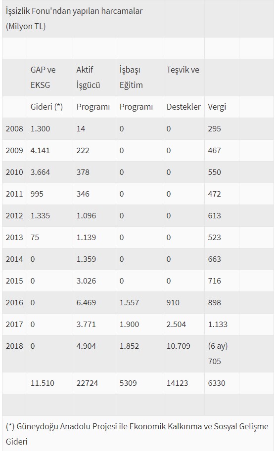 Buna karşılık fondan 2008-2013 yılları arasında Güneydoğu Anadolu Projesi (GAP) ile Ekonomik Kalkınma ve Sosyal Gelişme Gideri için 11.5 milyar lira aktarıldı. Aktif işgücü programlarına 22.7 milyar lira, işbaşı eğitim programlarına 5.3 milyar, teşvik ve desteklere de 14.1 milyar lira harcandı.