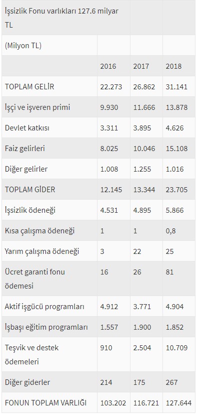 İşsizlik Fonu’ndaki toplam varlıklar 2017 yılında bir önceki yıla göre 13.5 milyar lira artarken, 2018’de varlıklardaki artış 10.9 milyar lirada kaldı. 2016’da 22.3 milyar lira olan fonun gelirleri 2017’de 26.9 milyara, 2018’de 31.1 milyar liraya yükseldi. Geçen yıl gelirlerdeki artışın 5 milyarı, faiz gelirlerindeki artıştan kaynaklandı.