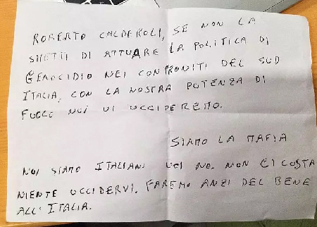 İtalya Bölgesel İşler ve Özerklik Bakanı Roberto Calderoli, dün yaptığı açıklamada “Güney'e karşı soykırım politikasını uygulamaktan vazgeçmezseniz, sizi ateş gücümüzle öldüreceğiz. Biz mafyayız, seni öldürmenin bize hiçbir maliyeti yok” yazan bir ölüm tehdidi aldığını duyurdu.
