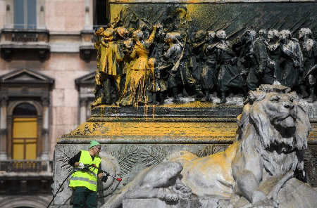 (Milano'da geçen yıl boyanan bir heykelin temizlenişi)