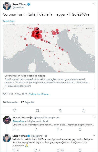 Usta oyuncu Serra Yılmaz'dan korona virüs açıklaması geldi. Bir takipçisi Serra Yılmaz'a, "Umarım sizler iyisinizdir Serra Hanım… Aklım sizde… Hepimize geçmiş olsun" dedi.