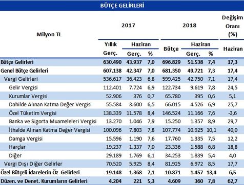 Hazine ve Maliye Bakanlığı tarafından yapılan açıklamaya göre merkezi yönetim bütçesi Haziran'da 25.6 milyar TL açık verdi. 2017 yılı Haziran ayında bütçe açığı 13,7 milyar TL olmuştu. Ocak Haziran dönemindeki bütçe açığı ise 46 milyar 91 milyon TL oldu. 2017'nin aynı döneminde bu rakam 25 milyar 235 milyon TL'ydi. Haziran ayında faiz dışı açık 23.2 milyar TL oldu. Bu yılın ocak haziran döneminde 12 milyar 283 milyon TL'ye ulaşan faiz dışı açık 2017'nin ocak-haziran döneminde 1 milyar 755 milyon TL seviyesindeydi.