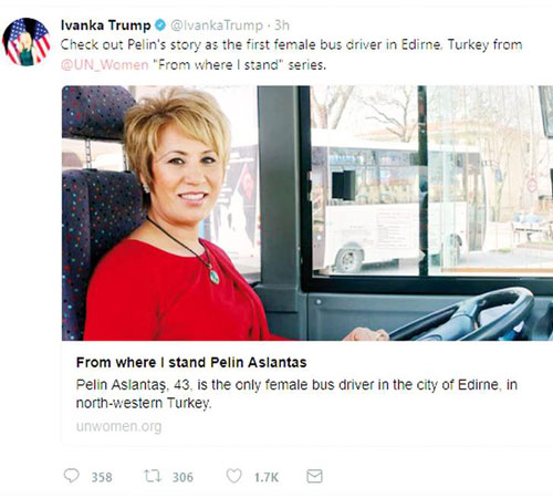 Ivanka, dün Twitter hesabından Aslantaş’ın UnWomen’ın sitesinde yer alan hikâyesini “Otobüs şoförü Pelin’in hikâyesine göz atın” diyerek paylaştı. Ivanka’nın 4.5 milyona yakın takipçilerine aktardığı haber, 8 Mart Kadınlar Günü’nde yayınlanmıştı. Haberde Aslantaş, 202 erkek arasında tek kadın şoför olduğunu anlatıyordu.