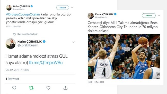 Kerim Çoraklık'ın attığı tweetlerde hükümetin başta FETÖ olmak üzere terör örgütleri ile mücadelesini her fırsatta eleştirildiği, terör örgütünün elebaşı Gülen'e de methiyeler dizdiği görüldü.