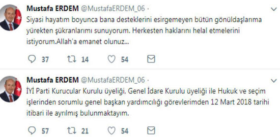 “İYİ Parti Kurucular Kurulu üyeliği, Genel İdare Kurulu üyeliği ile Hukuk ve seçim işlerinden sorumlu genel başkan yardımcılığı görevlerimden 12 Mart 2018 tarihi itibari ile ayrılmış bulunmaktayım.