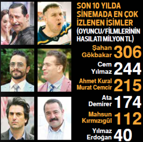 Türk sinema endüstrisi son yıllarda yerli filmlerle büyürken bu alanda başrol oyuncularının da büyük etkisi var. Sinemada izleyicinin en çok tercih ettiği isimler ise Şahan Gökbakar, Cem Yılmaz, Ahmet Kural-Murat Cemcir, Ata Demirer, Mahsun Kırmızıgül ve Yılmaz Erdoğan oldu. Bu isimlerin rol aldığı filmler 10 yılda 1 milyar liradan fazla gişe geliri elde etti. Listenin ilk sırasında ise Recep İvedik serisi ile Şahan Gökbakar yer alıyor. İkinci sırada Cem Yılmaz, 3’üncü sırada Ata Demirer var. Şahan Gökbakar’ın bugüne kadar rol aldığı filmlerin hasılatı 306 milyon lirayı aştı.(Hürriyet/Ceyhun Kuburlu)