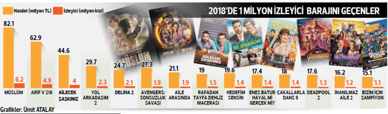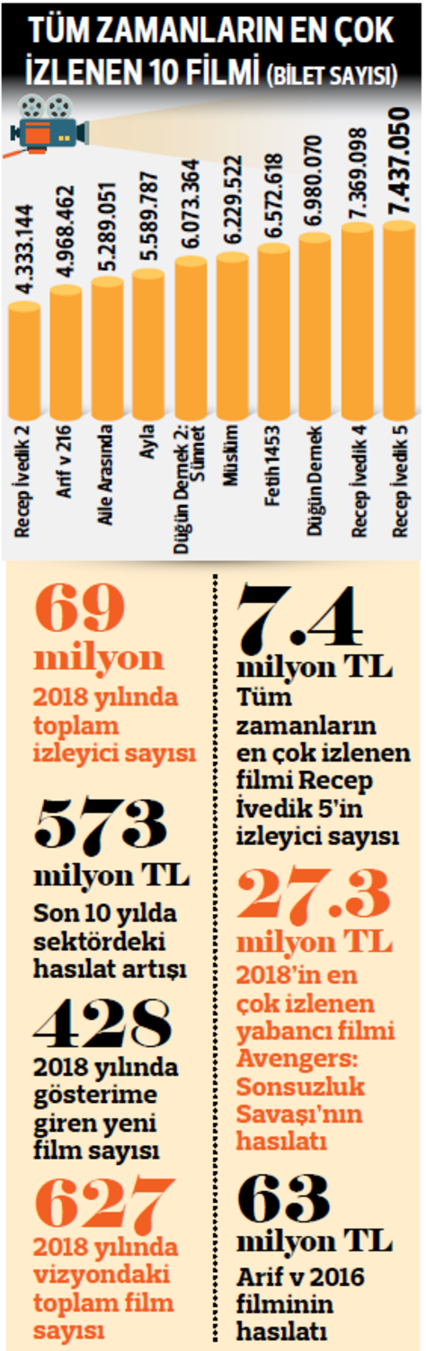 2008’de 301 milyon TL olan hasılat da 874 milyon liraya yükseldi. 14 filmin 1 milyon barajını geçtiği sektörde, sadece 2 yabancı yapım listede kendisine yer bulabildi. 2018’in en çok izlenen filmleri listesinde Müslüm’ü Cem Yılmaz’ın Arif v 216 filmi izledi. Arif v 216 4.9 milyon izleyici ile 63 milyon TL hasılat yaptı. Arif v 216’yı sırasıyla Ailecek Şaşkınız, Yol Arkadaşım 2 ve Deliha 2 izledi. Avengers: Sonsuzluk Savaşı ve Deadpool 2 yılın en çok izlenen yabancı yapımları oldu.