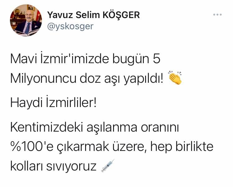 Köşger, "Mavi İzmir'imizde bugün 5 milyonuncu doz aşı yapıldı. Haydi İzmirliler. Kentimizdeki aşılanma oranını yüzde 100'e çıkarmak üzere, hep birlikte kolları sıvıyoruz" dedi.