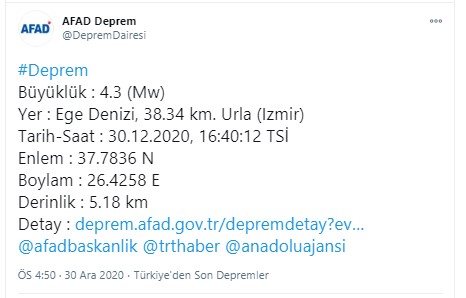 Saat 16.40'ta İzmir'in Urla ilçesinde yerin 5 kilometre derinliğinde 4,3 büyüklüğünde bir deprem meydana geldi.