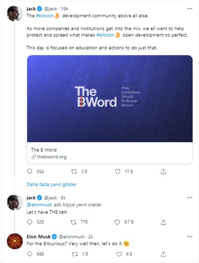 Dorsey, Musk'a "Gel toplantıda konuyu ele alalım. Tüm şüphelerini ortaya koyarsın" teklifi getirdi. Musk, "Hadi yapalım" yanıtı verdi.