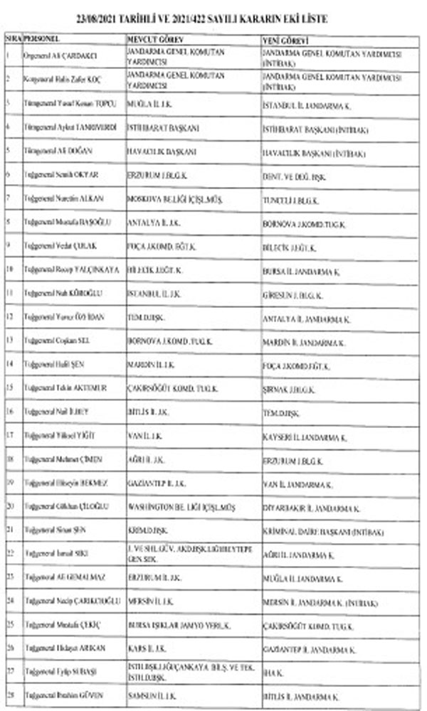 Buna göre, Tuğgeneral Hakan Saraç, Tuğgeneral Turgay Aras, Tuğgeneral Ali İhsan Ersoy ve Tuğgeneral Alper Sır emekliye sevk edildi.