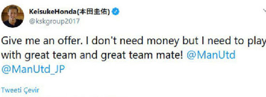 İngiliz devine "Bana teklif yapın" çağrısında bulunan Honda, "Paraya ihtiyacım yok ama harika takımla oynamalıyım" yazdı.