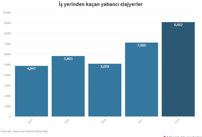 Yamaoka’nın sözünü ettiği çalışma koşulları, son olarak Adalet Bakanlığı’na bağlı Japon Göçmen Ajansı’nın (ISA) yayımladığı bir rapor üzerinden tartışma konusu oldu. ISA’nın verilerine göre 2018 yılında Japonya’da 9 bin 52 yabancı uyruklu stajyer işyerlerinden kaçarak kayıplara karıştı. 2014’le kıyaslandığında bu sayının yaklaşık iki katına çıktığı görülüyor. Stajyerlerin kaçış sebepleri ise ‘uzun mesai saatleri, düşük ücret ve dışlamalara maruz kalmak’ olarak sıralanıyor.
