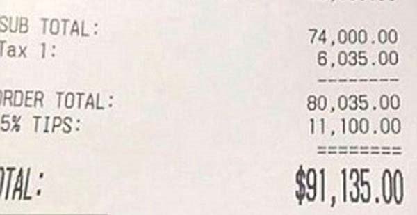 Ünlü rapçinin, 80 bin 35 dolarlık hesabının üzerine 11 bin 100 dolarlık bahşiş bıraktığı öğrenildi.