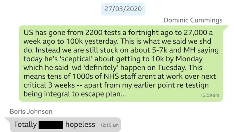 Cummings bu ifadelerin kullanıldığına kanıt olarak Johnson ile arasındaki 27 Mart 2020'deki WhatsApp yazışmasının ekran görüntüsünü gösterdi.