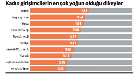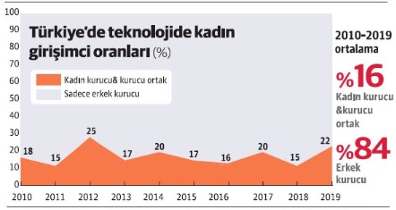 Geçen yıl kurulan girişimlerin yüzde 16’sı kadınların kurduğu ya da kurucu ortaklarından biri olduğu girişimlerden oluştu. Dünya Gazetesi'nden Selenay Yağcı haberine göre, Türkiye, kadın girişimci oranında ise Çekya, İtalya, ve Portekiz’den sonra Avrupa’da 4’üncü sırada yer aldı. Kadın girişimcilerin en yoğun olduğu dikeylerde ise yüzde 58’le bebek alanı birinci olurken, onu yüzde 54’le sosyal girişim, yüzde 53’le moda, yüzde 50 ile nano teknoloji, yüzde 47 ile biyoteknoloji takip ediyor. Kadın girişimlerinin aldığı yatırım ise 5 milyon dolarla 2019’da dip yaptı. 2018’de kadın girişimlerinin aldığı yatırım miktarı 15 milyon dolarla yüzde 24 oranına sahipken, 2019 yılında ise yüzde 5’e düştü. Bunda Getir’in aldığı 38 milyon dolarlık yatırımın da etkisi bulunuyor. Yatırım adetlerine bakıldığında ise 2018’de toplamda 17 kadın girişime yatırım yapılırken, 2019’da 12 kadın girişimine yatırım yapıldı.