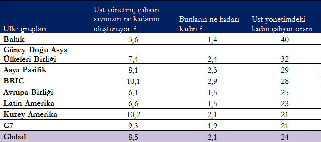 Bağımsız denetim, vergi ve danışmanlık firması Grant Thornton’un her sene gerçekleştirdiği ve Dünya Kadınlar Günü’nde açıkladığı araştırmanın bu seneki sonuçları, 2010’dan bu yana gerçekleşen en yüksek sonuçlara işaret ediyor. Gelişmiş ülkelerde, beklenenin aksine daha yavaş olsa da, dünya genelinde geçmiş yıllara göre bir artış var. Grant Thornton’un araştırma sonuçlarına göre, 2013 yılında şirketlerin üst yönetiminin %24’ü kadınlar tarafından dolduruluyor. Bu oran 2011’de %20 ve 2012’de %21 düzeyindeydi. Ülke gruplarına baktığımız zaman %21 ile G7 ve Kuzey Amerika ülkeleri sıralamada en geride yer alıyor. Kadın yönetici oranları Baltık ülkelerinde %40, Güneydoğu Asya ülkelerinde %32 ve BRIC ülkelerinde %28. Türkiye’nin 2013 yılı kadın yönetici istatistiği ise %30.