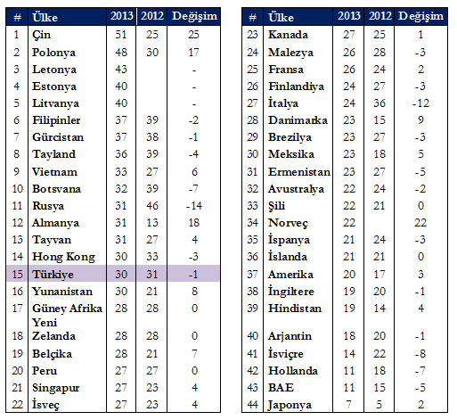 Grant Thornton’un araştırmasına göre gelişmiş ekonomiler, ligde geride. Örneğin İngiltere %19 ile 44 ülke arasında son sekiz içinde yer alıyor. Amerika %20 ile İngiltere’nin hemen üzerinde. Japonya ise bu konuda en kötü karneye sahip olan ülke. Japonya’da kadın yönetici oranı sadece %7. En kötü karneye sahip ülkeler Japonya’nın yanısıra, %11 ile Birleşik Arap Emirlikleri, %11 ile Hollanda ve %14 ile İsviçre. Diğer taraftan Türkiye %30’luk kadın yönetici oranı ile 44 ülke arasında 15. sırada kendine yer buluyor.