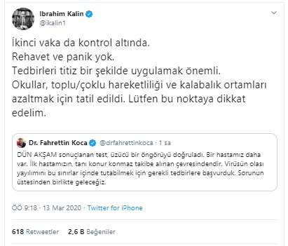 "Rehavet ve panik yok. Tedbirleri titiz bir şekilde uygulamak önemli. Okullar, toplu/çoklu hareketliliği ve kalabalık ortamları azaltmak için tatil edildi. Lütfen bu noktaya dikkat edelim."