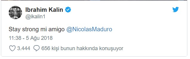 Cumhurbaşkanlığı Sözcüsü İbrahim Kalın, ülkesinde uğradığı bombalı saldırıdan yara almadan kurtulan Venezuela Devlet Başkanı Nicolas Maduro'ya destek mesajı yayınladı.