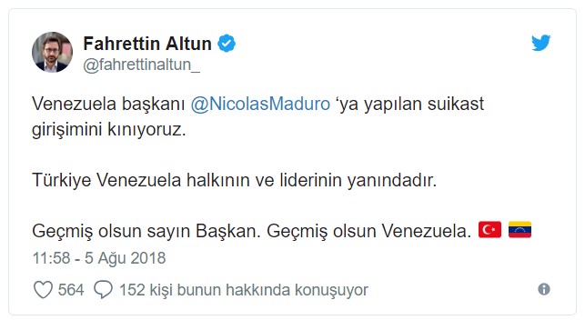 Altun, mesajında "Maduro'ya karşı düzenlenen suikast girişimini kınıyoruz. Türkiye, Venezuela halkı ve demokratik seçilmiş lideriyle beraberdir. Geçmiş olsun Sayın Başkan, geçmiş olsun Venezuela." ifadelerine yer verdi.