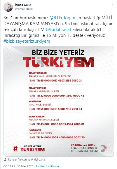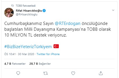 Cumhurbaşkanı Recep Tayyip Erdoğan’ın korona virüsü salgını nedeniyle alınan önlemlerin görüşüldüğü Kabine toplantısının ardından virüs dolayısıyla ekonomik durumaları bozulanlara yardım etmek amacıyla ‘Biz bize yeteriz Türkiyem’ sloganıyla başlattığı Milli Dayanışma Kampanyası‘na katılan bazı kişi ve kurumlar ile bağı miktarları şu şekilde: