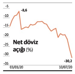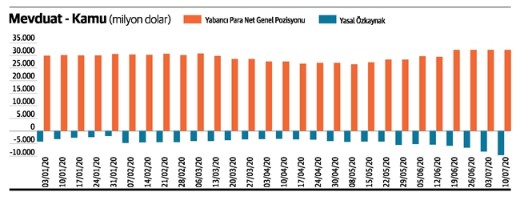 Yabancı mevduat bankaları ise 10 Temmuz haftasında 1 milyar 651 milyon dolarlık net döviz fazlası pozisyonuna sahip. Yerli mevduat bankalarının ise net döviz fazlası 2.3 milyar dolar seviyesinde.