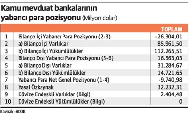 Bu yılın ilk haftasında 4.3 milyar dolar net döviz açık pozisyonu olan kamu mevduat bankalarındaki olumsuz seyir mayıs ile birlikte hızlandı. Dolar kurunun 6 Mayıs'ta kırdığı 7.26 liralık rekorun öncesi ve sonrasında kamu mevduat bankalarının döviz açık pozisyonu 5 milyar doların üzerine çıktı. Haziran sonu itibariyle de kamu mevduat bankalarının döviz net pozisyonu önce 6.7 milyar dolara, 3 Temmuz'da 8.3 milyar dolara ve son olarak 10 Temmuz'da da 9 milyar 740 milyon dolara yükseldi. BDDK'nın belirlediği yabancı para net pozisyonu yasal özkaynak oranı olan yüzde 20 sınırını ise bu yıl ilk kez 26 Haziran haftasında aştı kamu mevduat bankaları. 26 Haziran haftasında oran yüzde 20,9 oldu. 3 Temmuz haftasında yüzde 25,8'e çıktı ve son olarak 10 Temmuz'da ise yüzde 30,22'ye ulaştı.