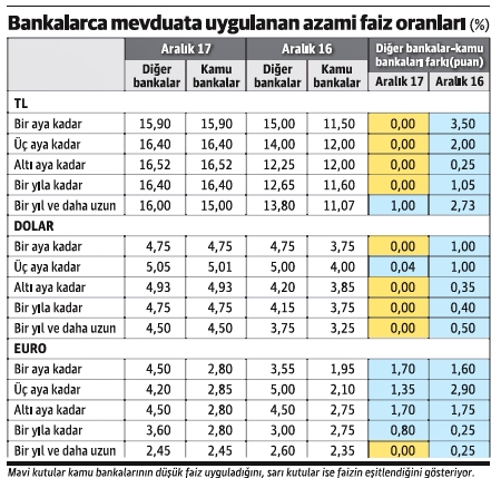 Kamu bankaları dışında kalan bankalar 2016'nın aralık ayında bir ay vadeli mevduata yüzde 15 faiz uyguladılar. Bu bankalar 2017'nin aralık ayında faizi yüzde 15.90'a çıkardılar.