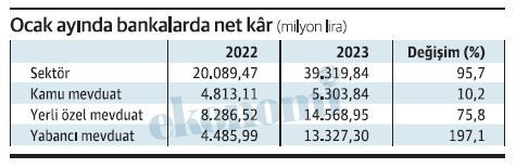 Şebnem Turhan'ın Ekonomim'de yer alan konuyla ilgili haberi şöyle: Bankacılık Düzenleme ve Denetleme Kurumu (BDDK) bankacılık sektörünün ocak ayı verilerini açıkladı. 2022 yılında net karı katlanan bankacılık sektörünün 2023 yılının ilk ayında net kar artışı yüzde 95,7 ile 39 milyar 319 milyon liraya çıktı. 2022 yılının ilk ayında ise 2021 yılının ocak ayına göre net kar artışı yüzde 370 seviyesindeydi. Uzmanlar bankacılık sektöründe 2022 yılı kadar yüksek net kar artışları görülmeyeceği beklentisindeydi.