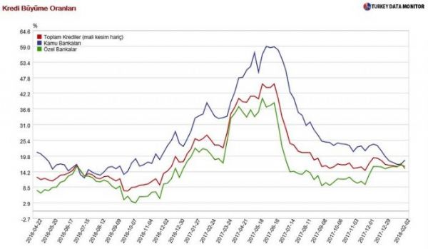 Buna karşın kamu bankalarında ise kredi büyümelerindeki geri çekilme daha yavaş oldu. 2 Şubat haftası itibariyle kamu bankalarında kredi büyüme hızı yüzde 18,3 olarak gerçekleşti.