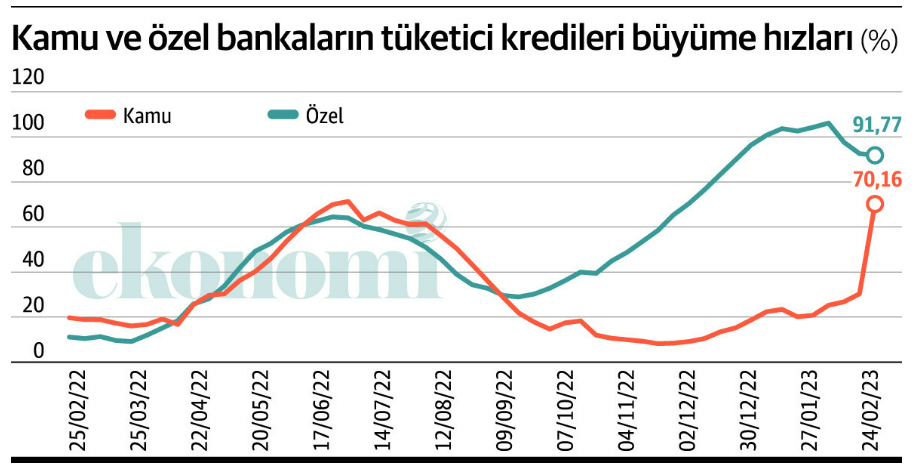 Bu gidişata dur demek için de şubat ayı ile beraber ise kamu bankalarında tüketici kampanyalarına hız verildi. BDDK haftalık verilerine göre kamu mevduat bankaları 24 Şubat itibariyle toplam tüketici kredileri içindeki payını 17 Şubat haftasına göre 1.2 puan arttırdı ve yüzde 38,81'e yükseltti. Tüketici kredi büyümesi de 24 Şubat haftasında hızlı bir sıçramayla yüzde 70,2’ye çıktı. 17 Şubat haftasında kredi büyüme oranı yüzde 30,3 sevisinde bulunuyordu.