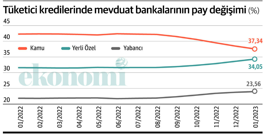 Yerli özel ve yabancı mevduat bankaları ise tüketici kredilerindeki paylarını hızlı şekilde büyüttü. BDDK aylık verilerine göre yerli özel mevduat bankalarının geçen yıl ocakta yüzde 31,3 olan toplam tüketici kredileri içinde aldıkları pay bu yıl ocakta yüzde 34'e, yabancı mevduat bankalarının da geçen yıl ocakta yüzde 21,4 olan payı da bu yıl ocakta yüzde 23,6'ya çıktı.