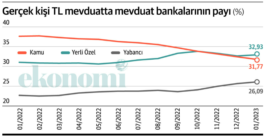 Bankacılık Düzenleme ve Denetleme Kurumu (BDDK) aylık verilerine göre gerçek kişilerde TL cinsi toplam mevduatta kamu mevduat bankalarının geçen yıl ocakta yüzde 37,62 olan payı bu yıl ocakta yüzde 31,77’ye kadar geriledi. Bu bireysel müşteri TL mevduatta 6 puanlık bir pay kaybına işaret ediyor. Yerli özel mevduat bankalarının bireysel müşterilerin toplam TL mevduattaki payı geçen yıl ocakta yüzde 31,04 iken bu yıl ocakta yüzde 32,93’e çıktı. Yabancı mevduat bankalarının da geçen yıl yüzde 22,69 olan payı yüzde 26,09’a hızlı yükseldi.