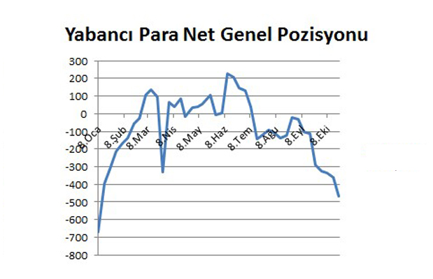 Yabancı para net genel pozisyonu 15 Ekim haftasında 361 milyon dolar ekside olarak açıklanmıştı.