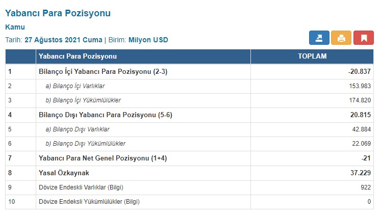 Yabancı para net genel pozisyonu 20 Ağustos haftasında 124 milyon dolar ekside olarak açıklanmıştı.