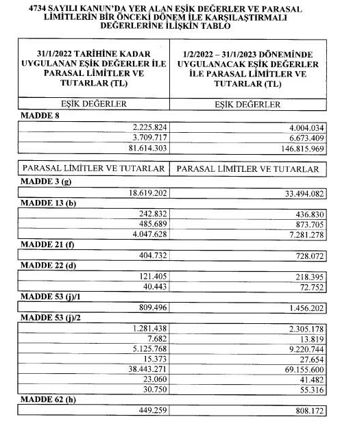 Kamu İhale Kurumu her yıl olduğu gibi bu yıl da kamu ihalelerinde kullanılacak eşik değerler ve parasal limitler güncellendi. Geçtiğimiz yıl yüzde 25 artış yapan kurum, bu yılki artışı yüzde 79,89 olarak açıkladı.