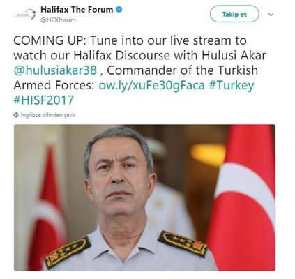 Hulusi Akar'ın Kanada'da düzenlediği forumda yaptığı konuşmadan önce forumun onaylı twitter hesabında paylaşılan fotoğraf dikkat çekti.