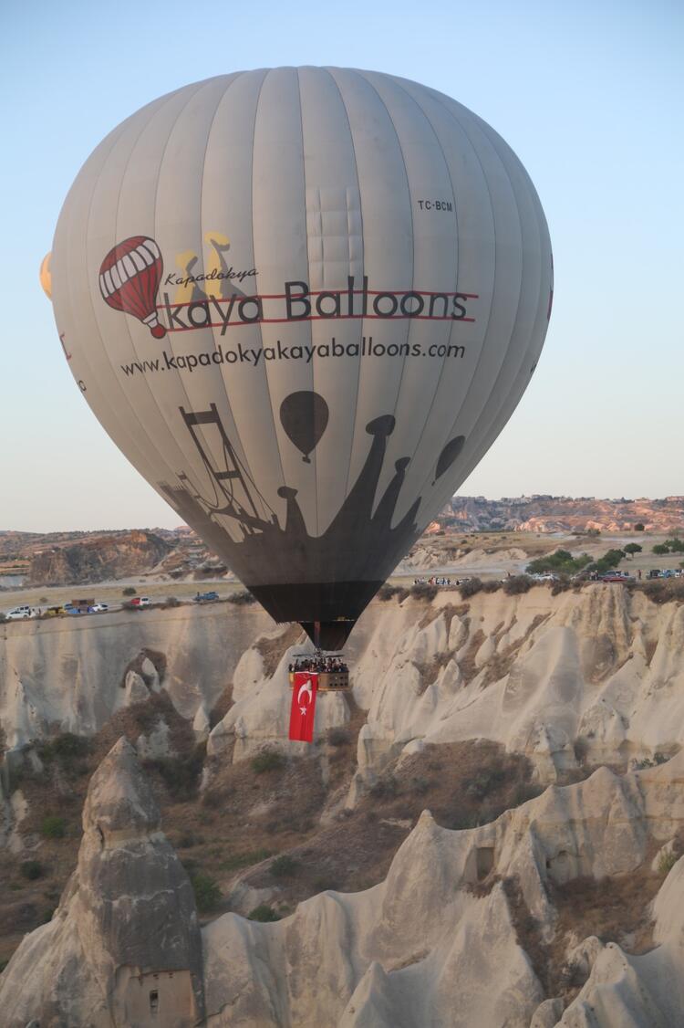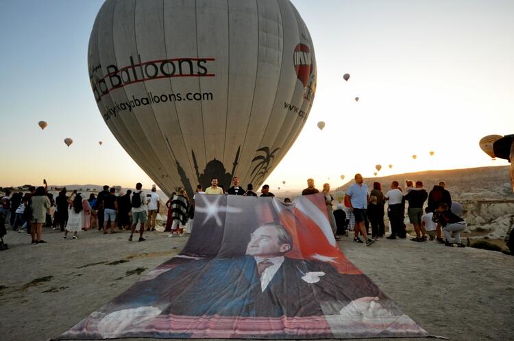 Kapadokya'da turistler, çektikleri fotoğraflarla "Büyük Zafer'in 100. yıl dönümü"nü ölümsüzleştirdi. Sepetlerinde Türk bayrakları asılı balonlar, peribacaları üzerinde süzüldü.