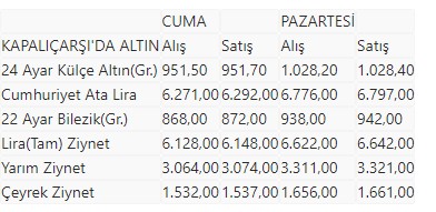 Kapalıçarşı'da alınıp satılan altın türlerinin, cuma günü ve bugün itibarıyla kapanış fiyatları (TL) şöyle: