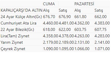 Kapalıçarşı'da alınıp satılan altın türlerinin, önceki ve bugün itibarıyla kapanış fiyatları (TL) şöyle: