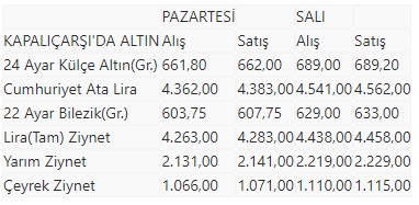 Kapalıçarşı'da alınıp satılan altın türlerinin, önceki ve bugün itibarıyla kapanış fiyatları (TL) şöyle:
