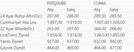 İstanbul Kapalıçarşı'da alınıp satılan altın türlerinin, önceki ve bugün itibarıyla kapanış fiyatları (TL) şöyle: