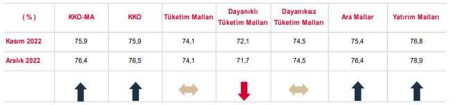 "İmalat sanayi genelinde mevsimsel etkilerden arındırılmış Kapasite Kullanım Oranı (KKO-MA), bir önceki aya göre 0,5 puan artarak yüzde 76,4 seviyesinde gerçekleşmiştir. Kapasite Kullanım Oranı (KKO), bir önceki aya göre 0,6 puan artarak yüzde 76,5 seviyesinde gerçekleşmiştir. "