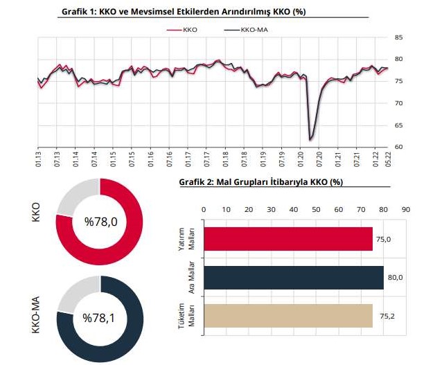İmalat sanayi genelinde kapasite kullanım oranı (KKO), Mayıs ayında bir önceki aya göre 0,2 puan artarak yüzde 78,0 seviyesinde gerçekleşti.
