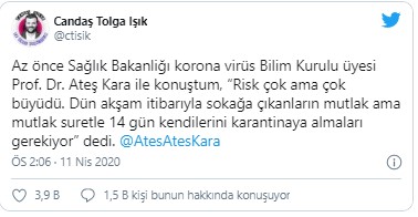 Posta yazarı Candaş Tolga Işık'a konuşan Kara, "Risk çok ama çok büyüdü. Dün akşam itibarıyla sokağa çıkanların mutlak ama mutlak suretle kendilerini karantinaya almaları gerekiyor" ifadesini kullandı.