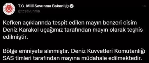 Bakanlıktan yapılan yazılı açıklamada, "Kefken açıklarında tespit edilen mayın benzeri cisim Deniz Karakol uçağımız tarafından mayın olarak teşhis edilmiştir.