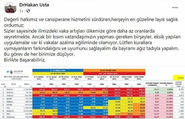 Trabzon İl Sağlık Müdürü Dr. Hakan Usta, sosyal medya hesabından Kovid-19 haftalık oran değişim tablosu paylaşarak, “Değerli halkımız ve cansiperane hizmetini sürdüren, her şeyin en güzeline layık sağlık ordumuz; Sizler sayesinde ilimizdeki vaka artışları ülkemize göre daha az oranlarda seyretmekte. Ancak bir kısım vatandaşımızın yapması gereken bir şeyler, eksik yapılan uygulamalar var ki vakalar azalma eğiliminde olamıyor. Lütfen kurallara uymayanların farkındalığını ve uyumunu sağlayalım da bayramı ağız tadıyla yapalım. Bu görev de her birimize düşüyor. Birlikte başarabiliriz” ifadelerine yer verdi.