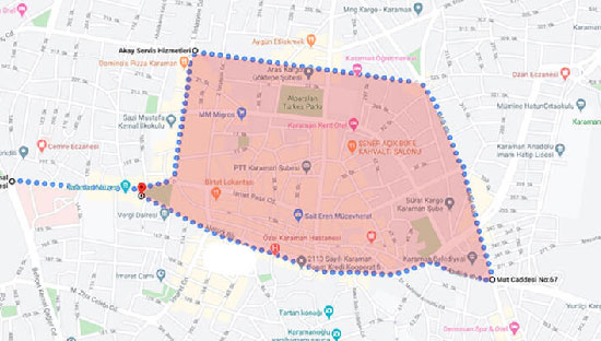 "Turgut Özal Caddesinin Karaman Kalesi önünden başlayan kısmından doğuya doğru Atatürk Bulvarı'nın tamamında, Atatürk Bulvarının Zeytin Dalı Bulvarı ile kesiştiği kavşaktan (Karaman Belediyesi Önü) kuzey yönüne doğru, Zeytin Dalı Bulvarı ile Kazımkarabekir Caddesi'nin kesiştiği kavşaktan batıya doğru, Kazımkarabekir Caddesi'nin 1. İstasyon Caddesi ile kesiştiği kavşaktan güneye doğru, 1. İstasyon Caddesi'nin İsmet Paşa Caddesi ile kesiştiği kavşaktan tekrar Turgut Özal Caddesi ile birleştiği noktalar arasında kalan tüm cadde, sokak ve park gibi tüm açık alanlarda 5 Ağustos Çarşamba günü saat 23:00'ten itibaren ikinci bir karara kadar hareket halinde veya oturarak vatandaşlar tarafından dondurma ve kuruyemiş yenilmemesine, sigara içilmemesine oy birliğiyle karar verilmiştir."