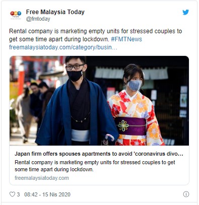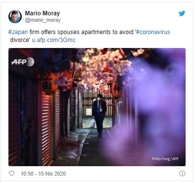 Japonya'da 'korona-boşanması' etiketinin Twitter'da yoğun dolaşımda olduğu dönemde, girişimci bir şirket, 'korona-boşanmasından' kaçınmak isteyen çiftlere ayrı daire hizmeti sunmaya başladı.
